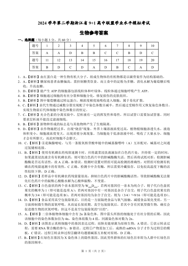 浙江省9+1高中联盟2024-2025学年下学期高一学业水平模拟考试生物答案