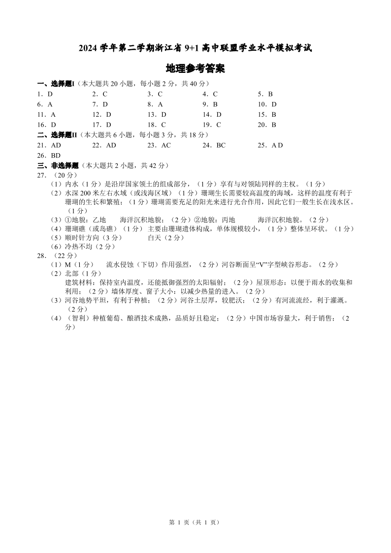 浙江省9+1高中联盟2024-2025学年下学期高一学业水平模拟考试地理答案