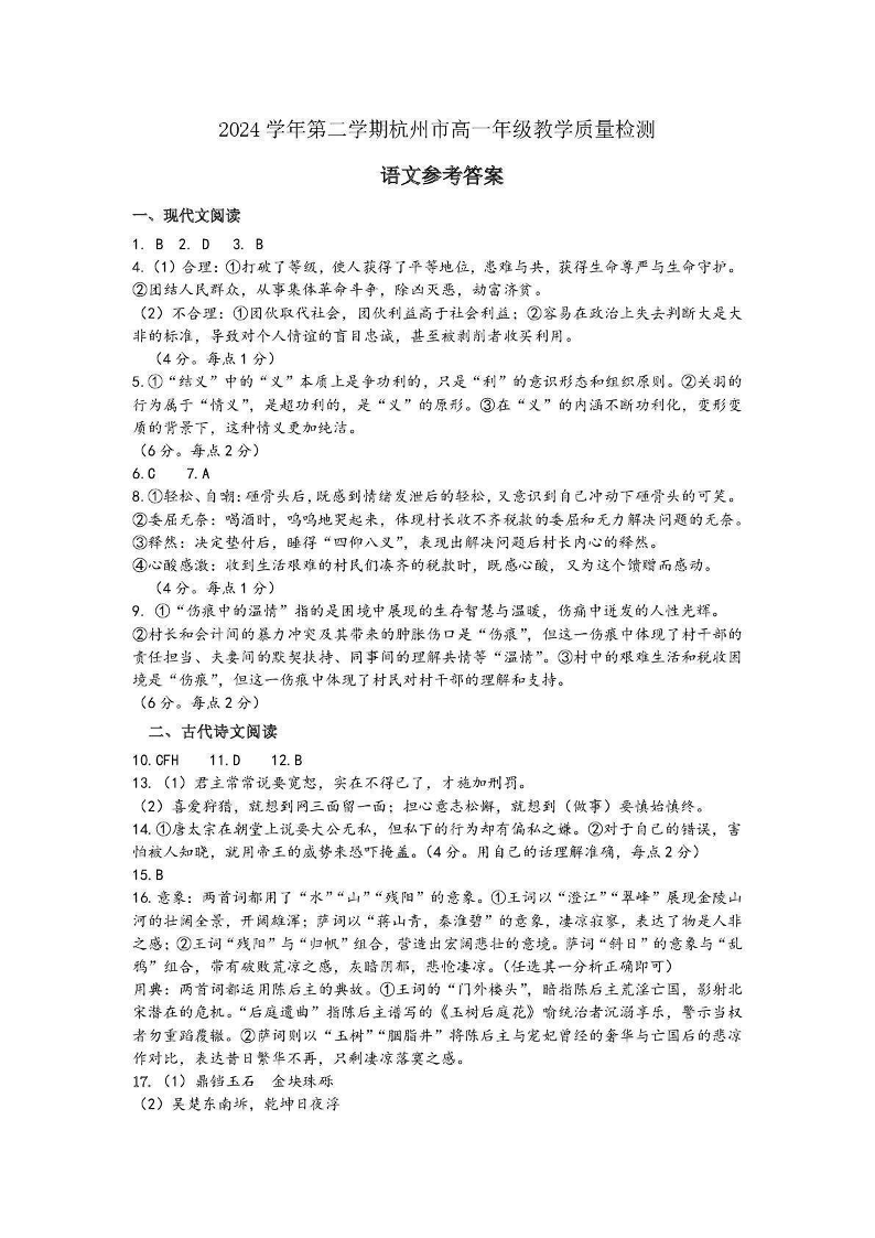 浙江杭州市2024-2025学年下学期6月高一期末考试语文答案