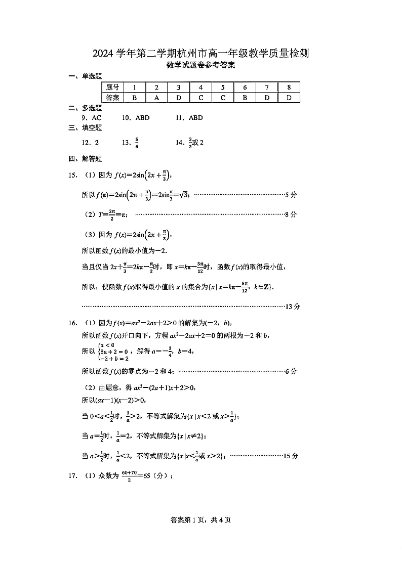 浙江杭州市2024-2025学年下学期6月高一期末考试数学答案