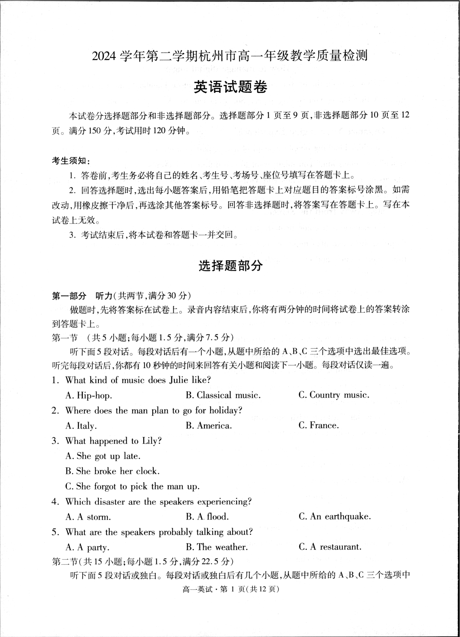 浙江杭州市2024-2025学年下学期6月高一期末考试英语