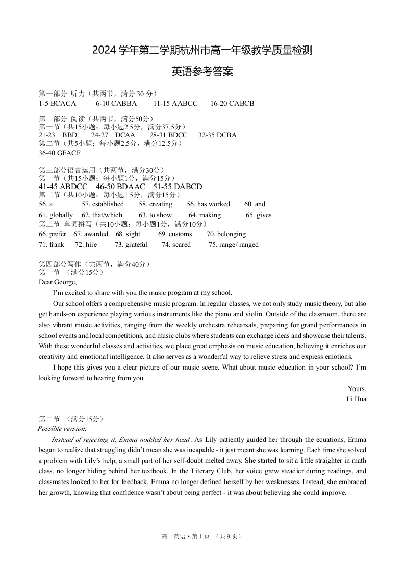 浙江杭州市2024-2025学年下学期6月高一期末考试英语答案