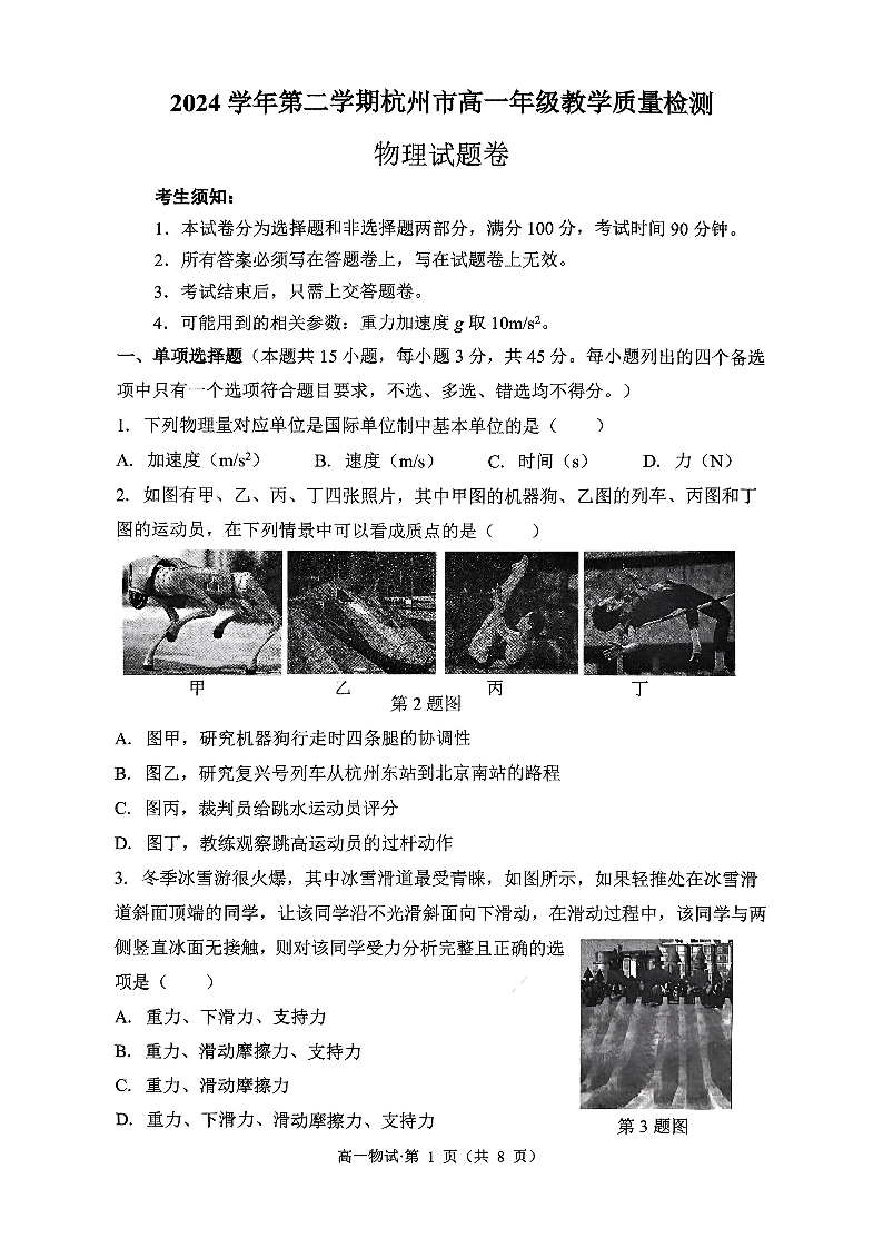 浙江杭州市2024-2025学年下学期6月高一期末考试物理
