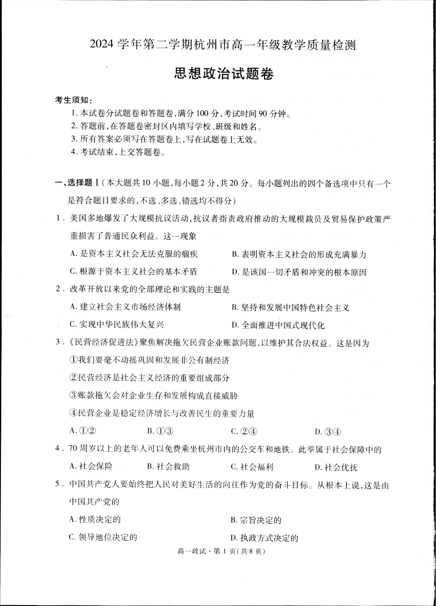 浙江杭州市2024-2025学年下学期6月高一期末考试政治