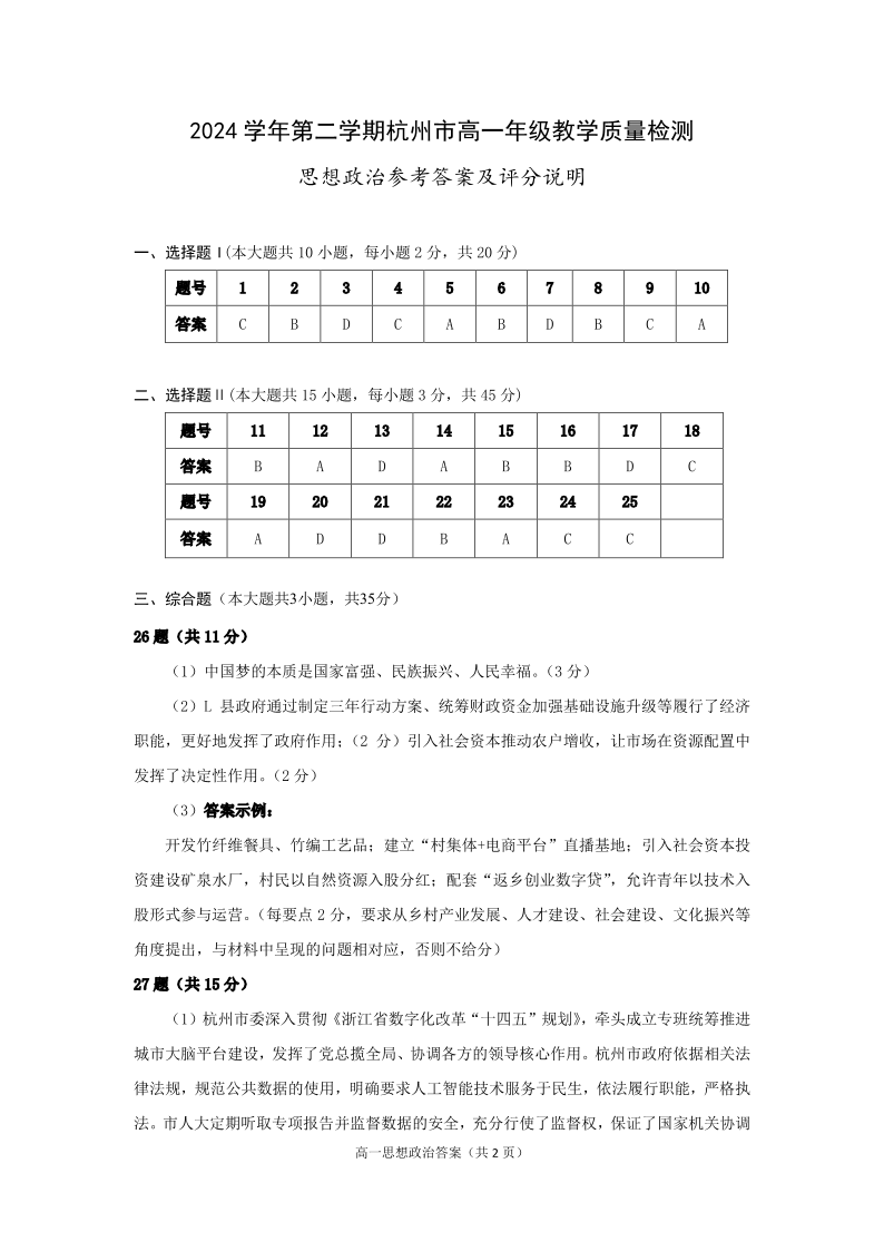浙江杭州市2024-2025学年下学期6月高一期末考试政治答案