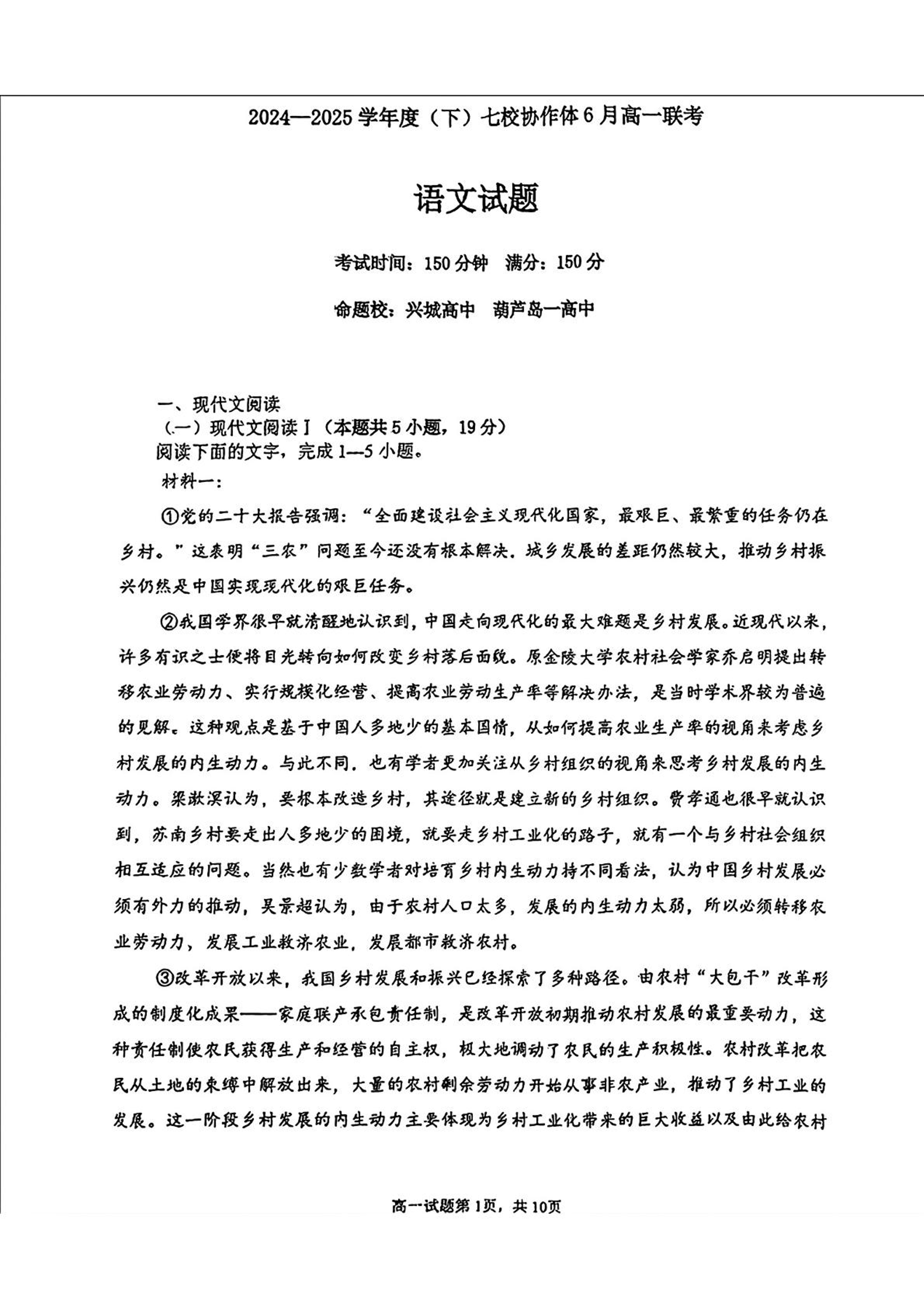 辽宁省七校协作体2024-2025学年下学期6月高一联考语文