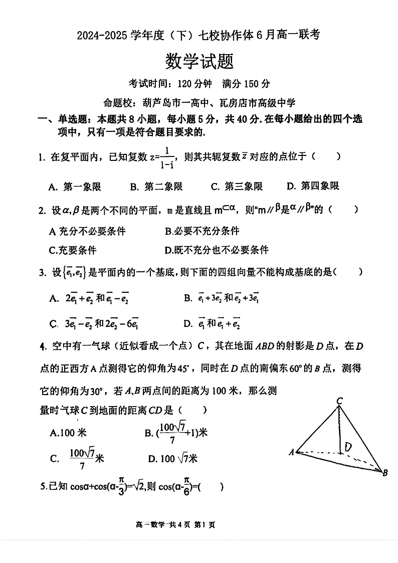辽宁省七校协作体2024-2025学年下学期6月高一联考数学+答案