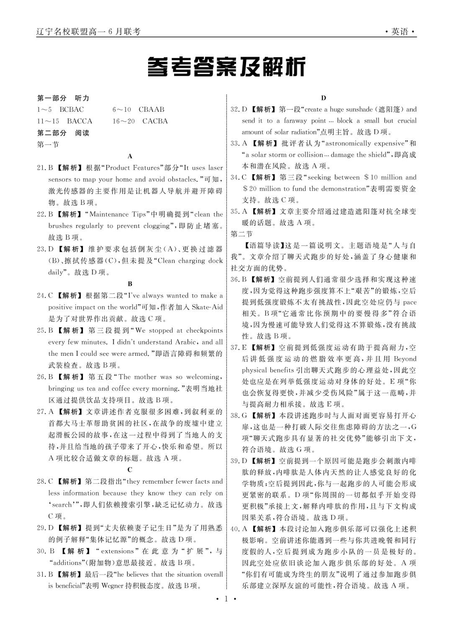 辽宁省名校联盟2024-2025学年下学期6月高一联合考试英语答案