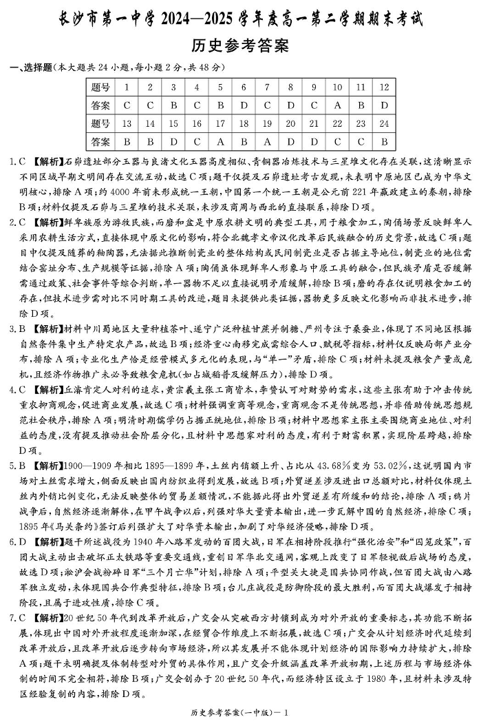 湖南省长沙市一中2024-2025学年下学期6月高一期末考试历史答案