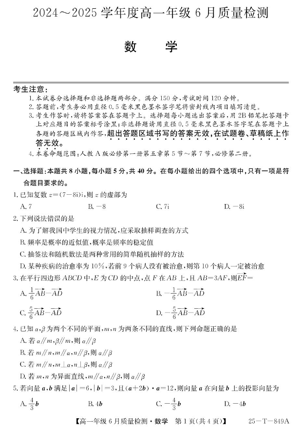 河北省邢台市七县多校2024-2025学年下学期6月高一质检数学+答案