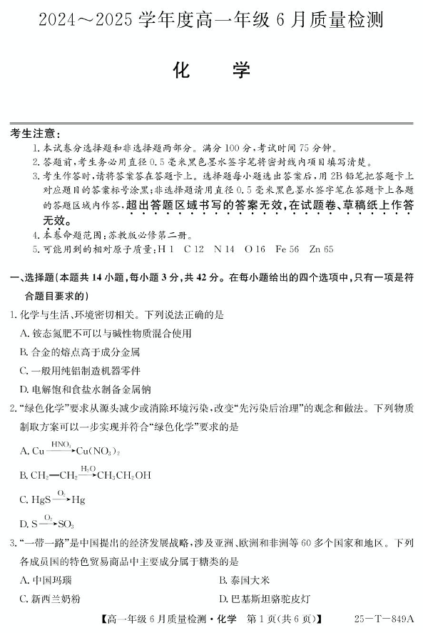 河北省邢台市七县多校2024-2025学年下学期6月高一质检化学+答案