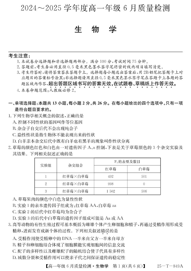 河北省邢台市七县多校2024-2025学年下学期6月高一质检生物+答案