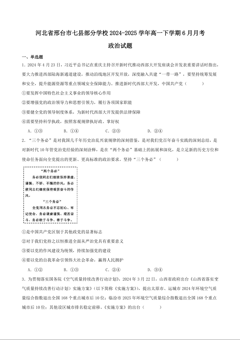 河北省邢台市七县多校2024-2025学年下学期6月高一质检政治+答案