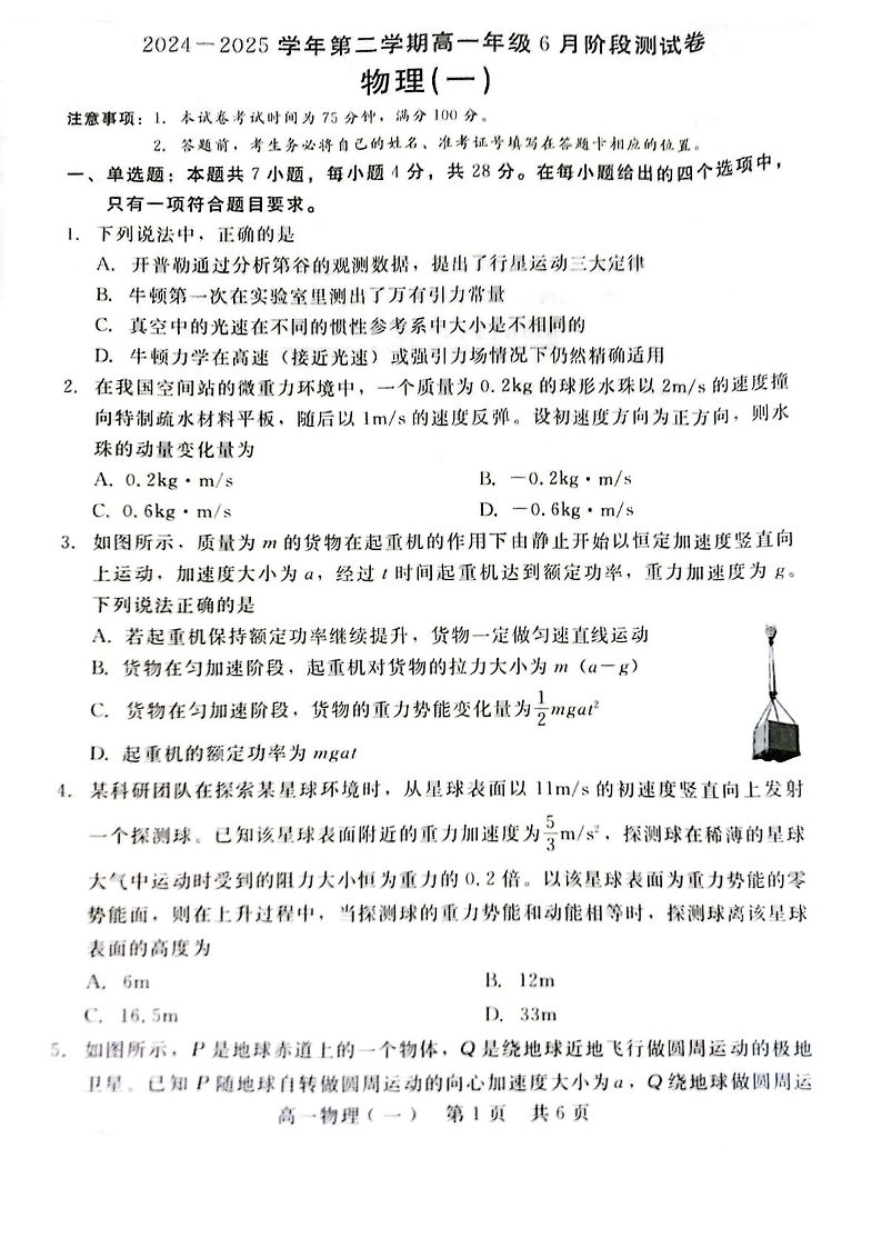 河北省石家庄市NT联考2024-2025学年下学期6月高一测试物理+答案