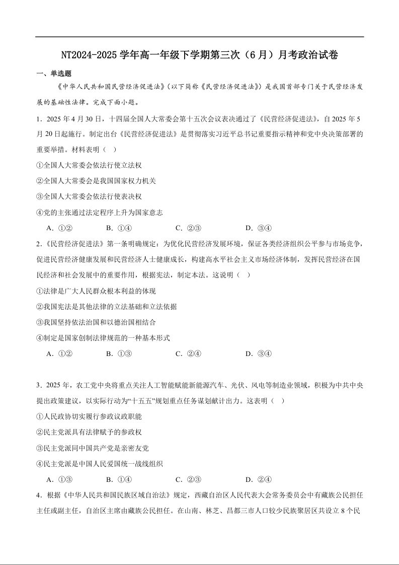 河北省石家庄市NT联考2024-2025学年下学期6月高一测试政治+答案
