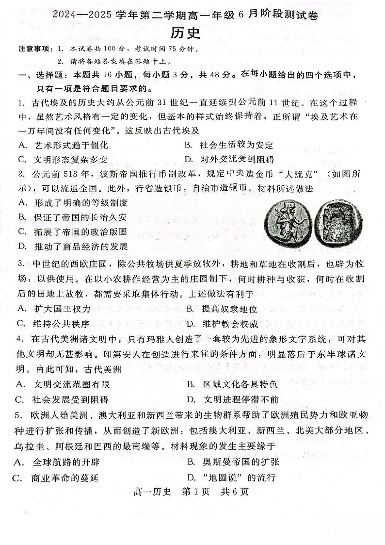 河北省石家庄市NT联考2024-2025学年下学期6月高一测试历史+答案