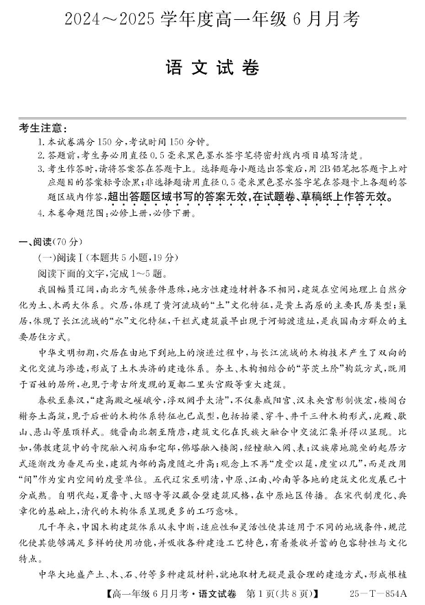 河北省部分高中2024-2025学年下学期6月高一月考语文