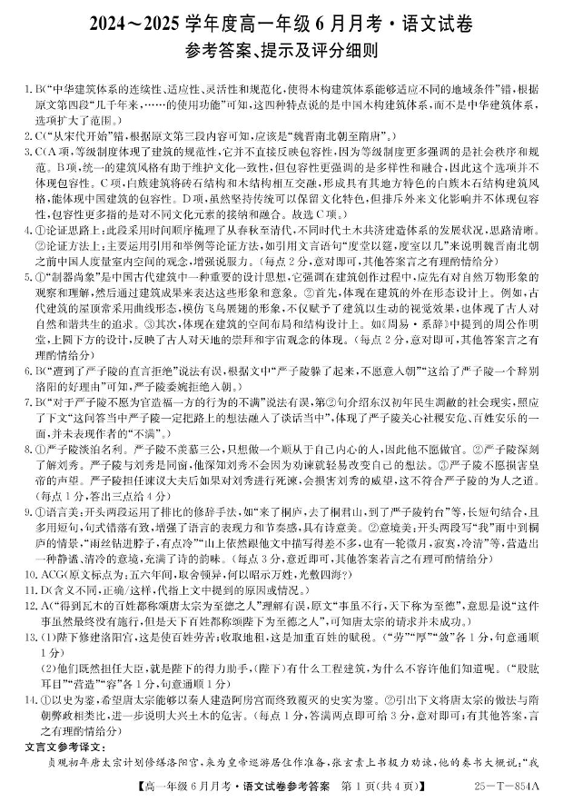 河北省部分高中2024-2025学年下学期6月高一月考语文答案