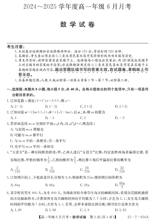 河北省部分高中2024-2025学年下学期6月高一月考数学