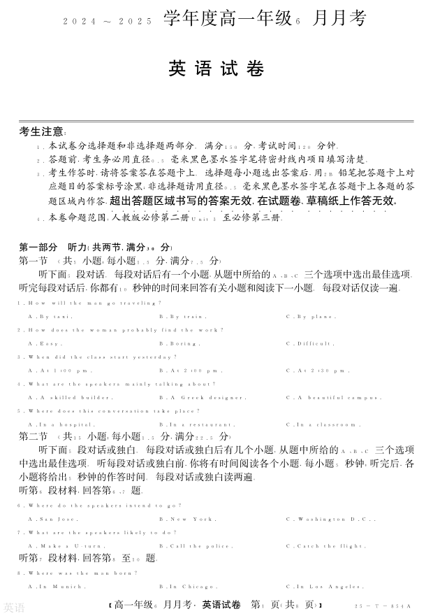 河北省部分高中2024-2025学年下学期6月高一月考英语+答案