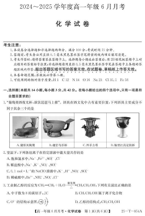 河北省部分高中2024-2025学年下学期6月高一月考化学