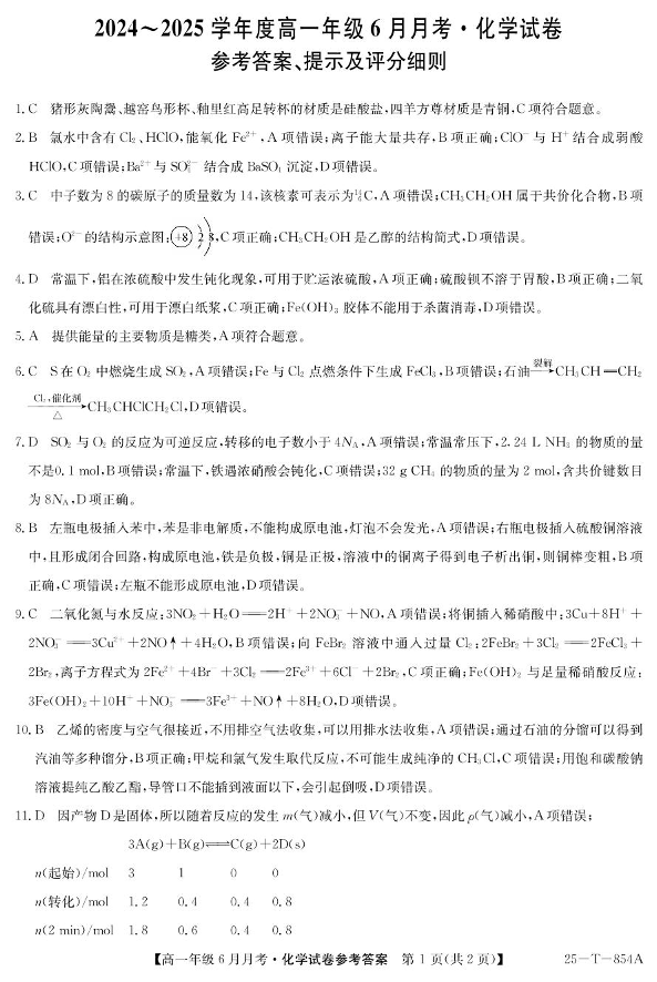 河北省部分高中2024-2025学年下学期6月高一月考化学答案