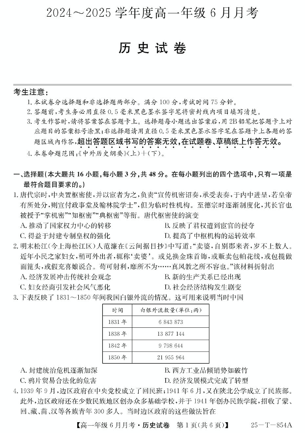 河北省部分高中2024-2025学年下学期6月高一月考历史