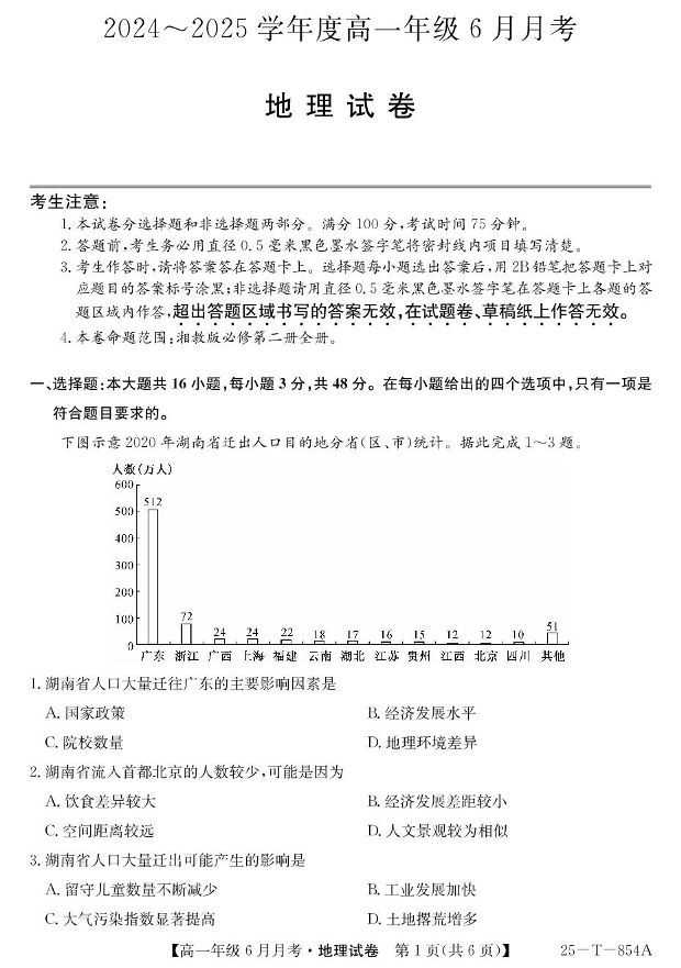 河北省部分高中2024-2025学年下学期6月高一月考地理+答案