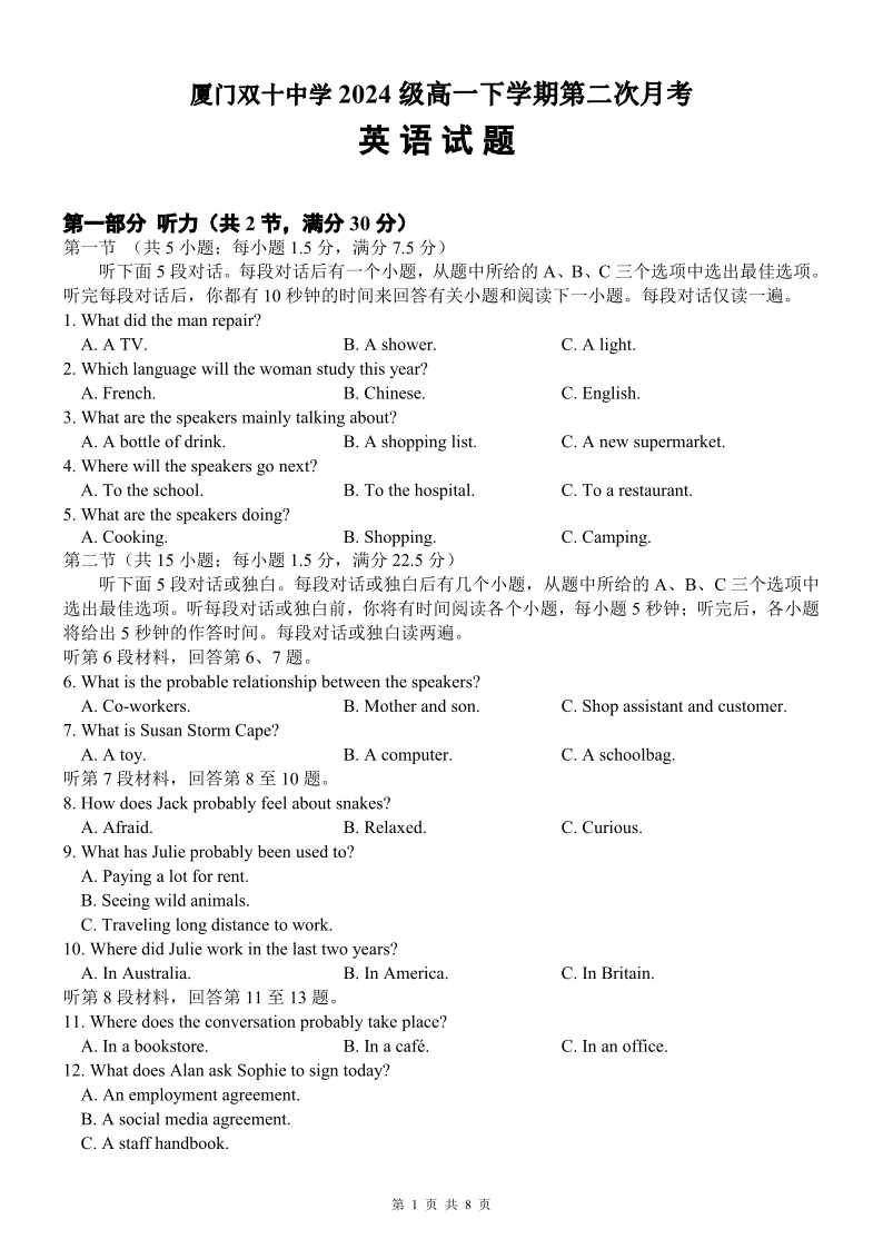 福建省厦门双十中学2024-2025学年下学期6月高一月考英语+答案
