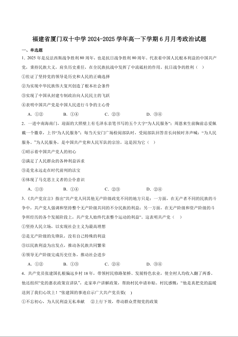 福建省厦门双十中学2024-2025学年下学期6月高一月考政治+答案