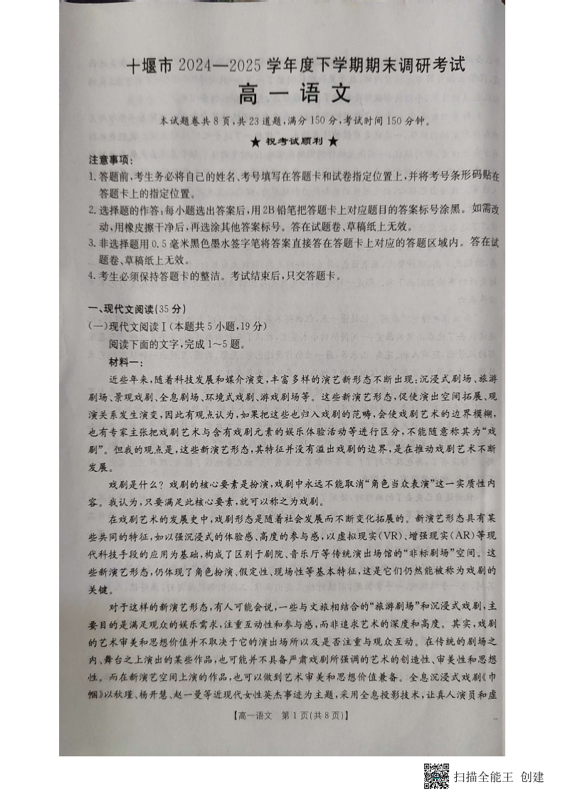 湖北省十堰市2024-2025学年高一下学期6月期末考试语文