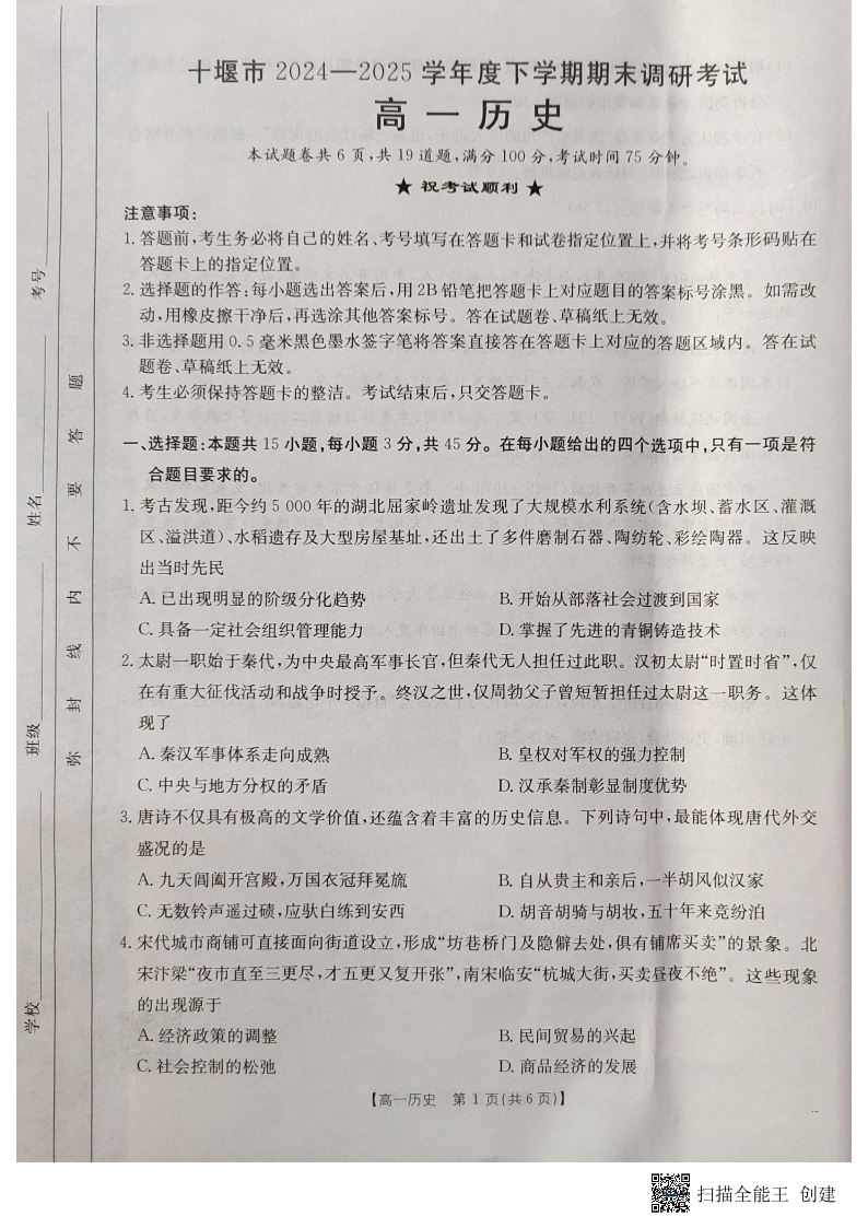 湖北省十堰市2024-2025学年高一下学期6月期末考试历史
