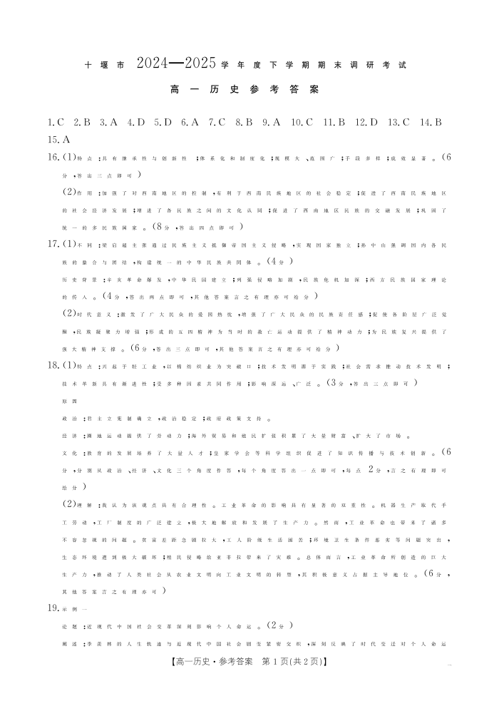 湖北省十堰市2024-2025学年高一下学期6月期末考试历史答案