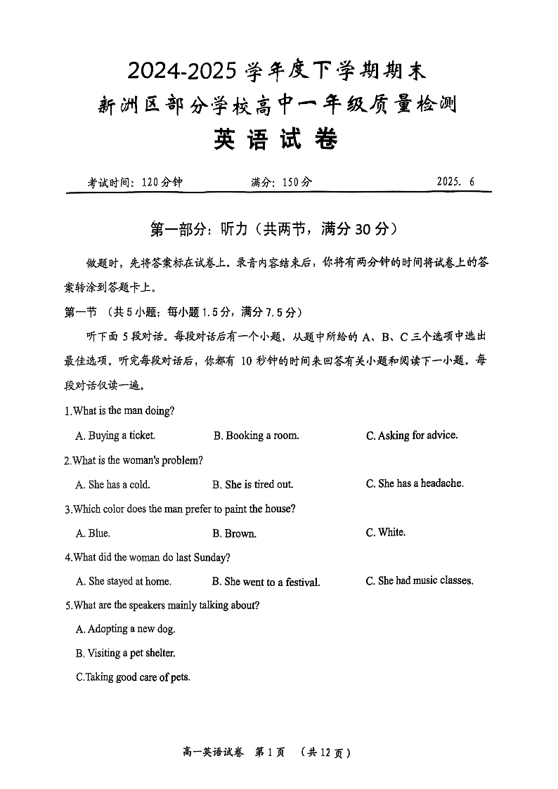 湖北省武汉市部分高中2024-2025学年下学期6月高一期末考试英语+答案