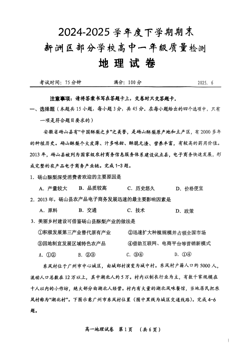 湖北省武汉市部分高中2024-2025学年下学期6月高一期末考试地理