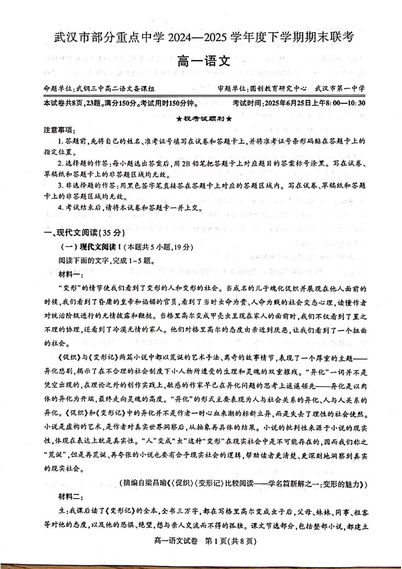 湖北省武汉市部分重点中学2024-2025学年下学期高一期末联考语文+答案