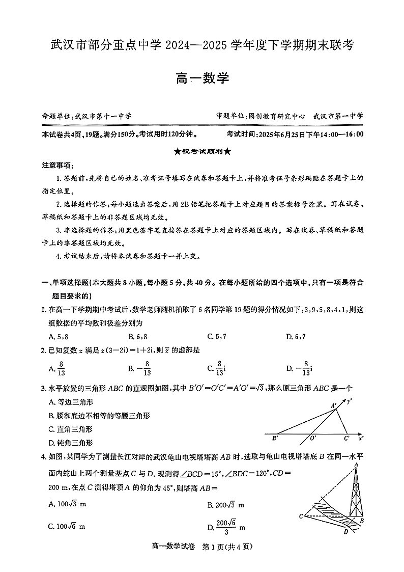 湖北省武汉市部分重点中学2024-2025学年下学期高一期末联考数学+答案