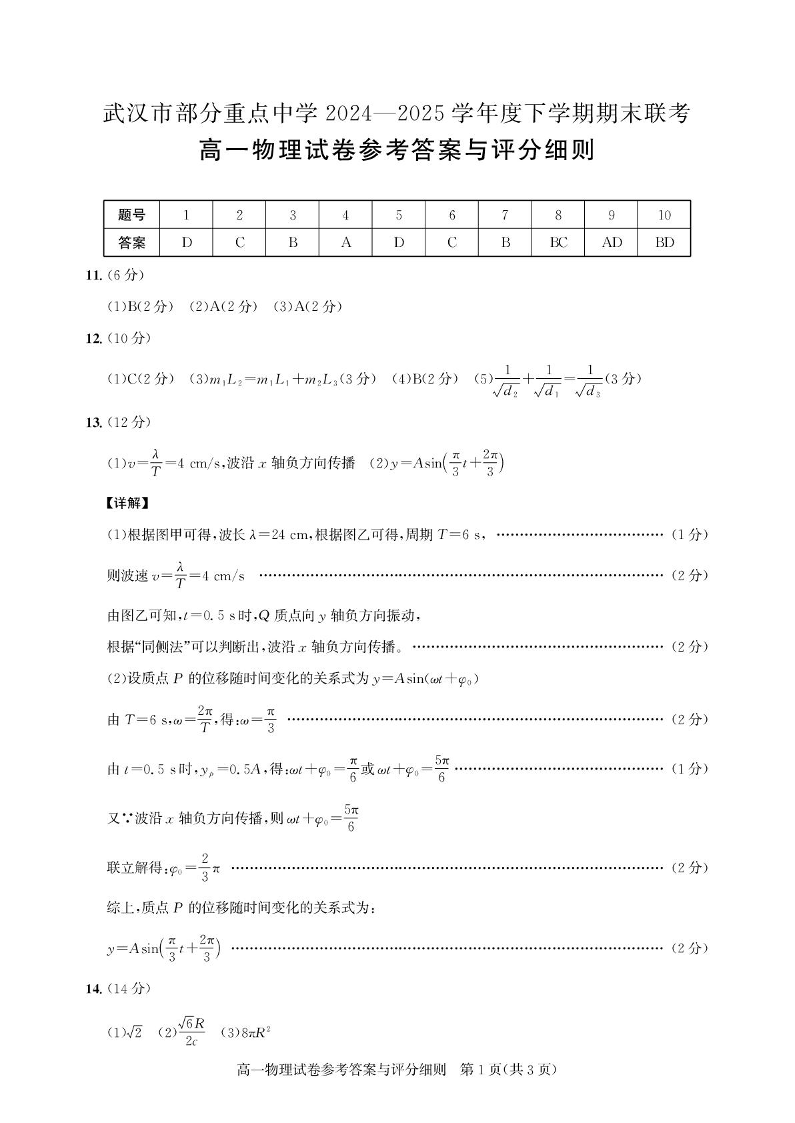 湖北省武汉市部分重点中学2024-2025学年下学期高一期末联考物理答案