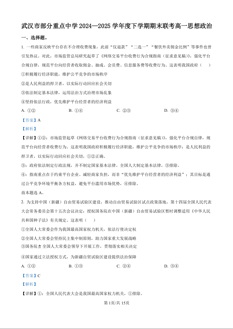 湖北省武汉市部分重点中学2024-2025学年下学期高一期末联考政治(精品解析版)