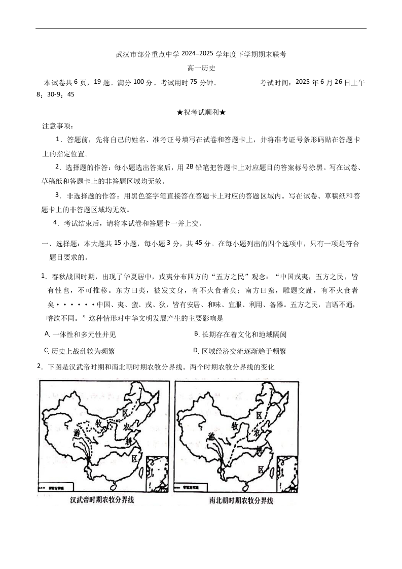湖北省武汉市部分重点中学2024-2025学年下学期高一期末联考历史+答案