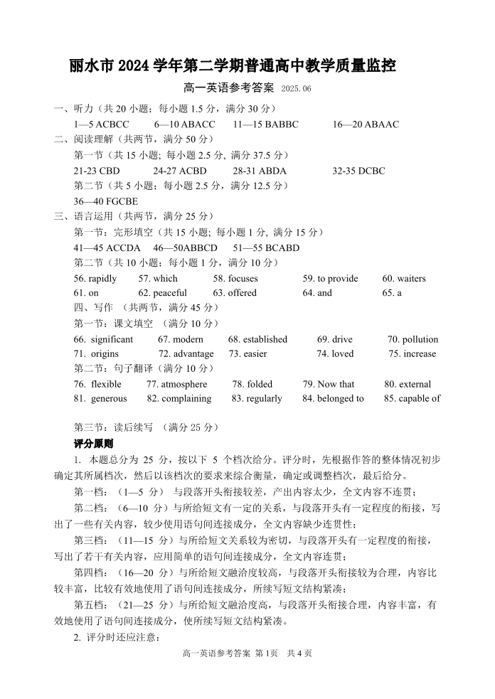 浙江省丽水市2024-2025学年下学期高一期末教学质量监控英语答案