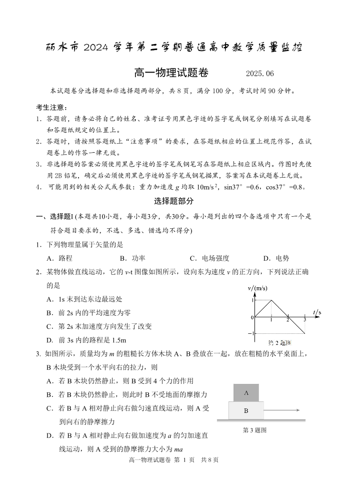 浙江省丽水市2024-2025学年下学期高一期末教学质量监控物理