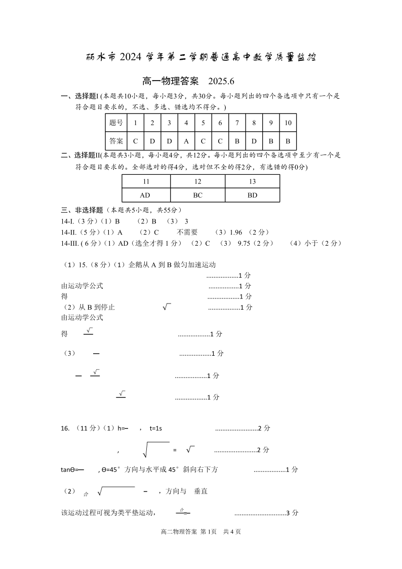 浙江省丽水市2024-2025学年下学期高一期末教学质量监控物理答案