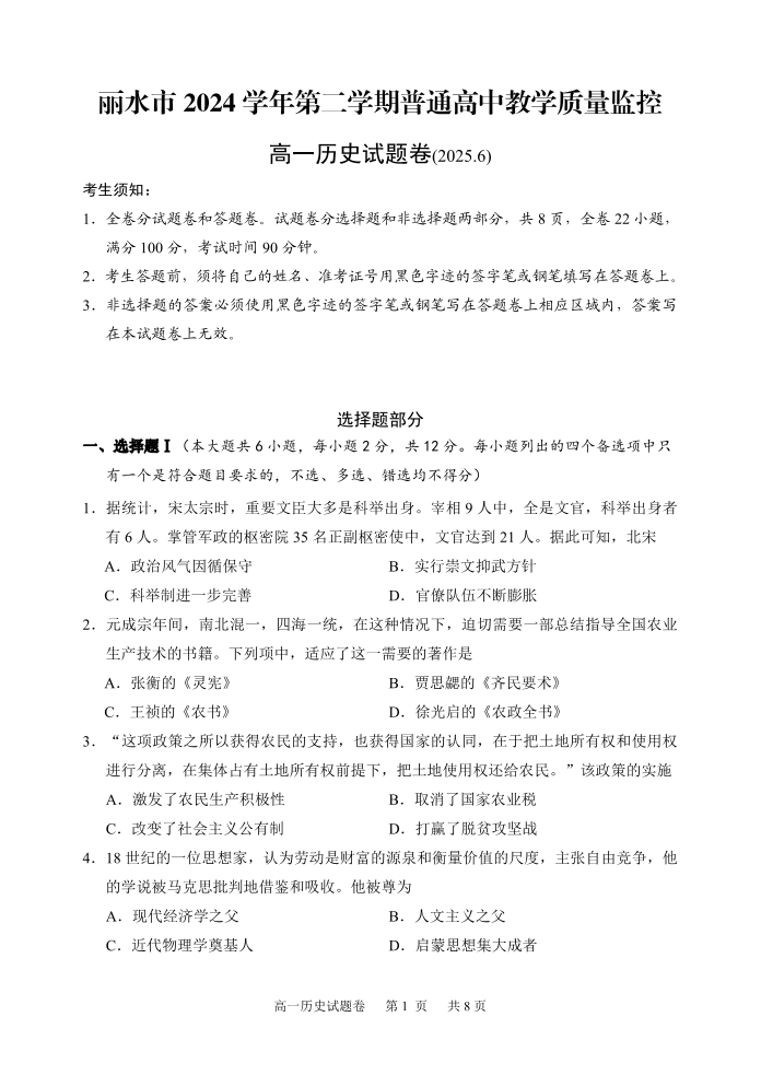 浙江省丽水市2024-2025学年下学期高一期末教学质量监控历史