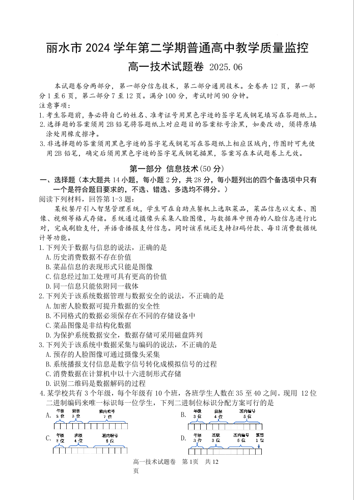 浙江省丽水市2024-2025学年下学期高一期末教学质量监控技术