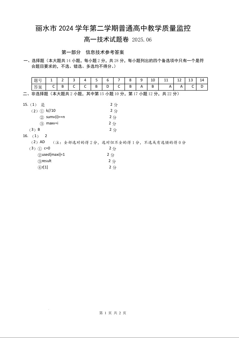 浙江省丽水市2024-2025学年下学期高一期末教学质量监控技术答案