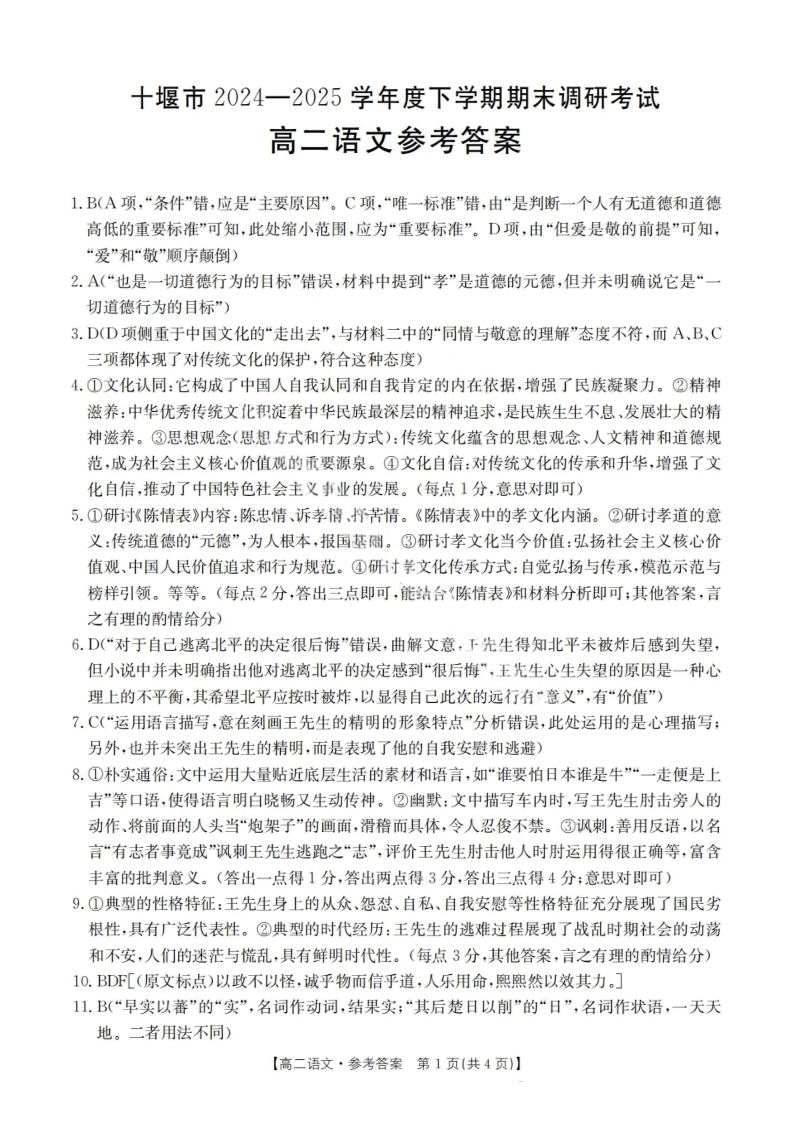湖北省十堰市 2024-2025学年度下学期高二期末调研语文答案