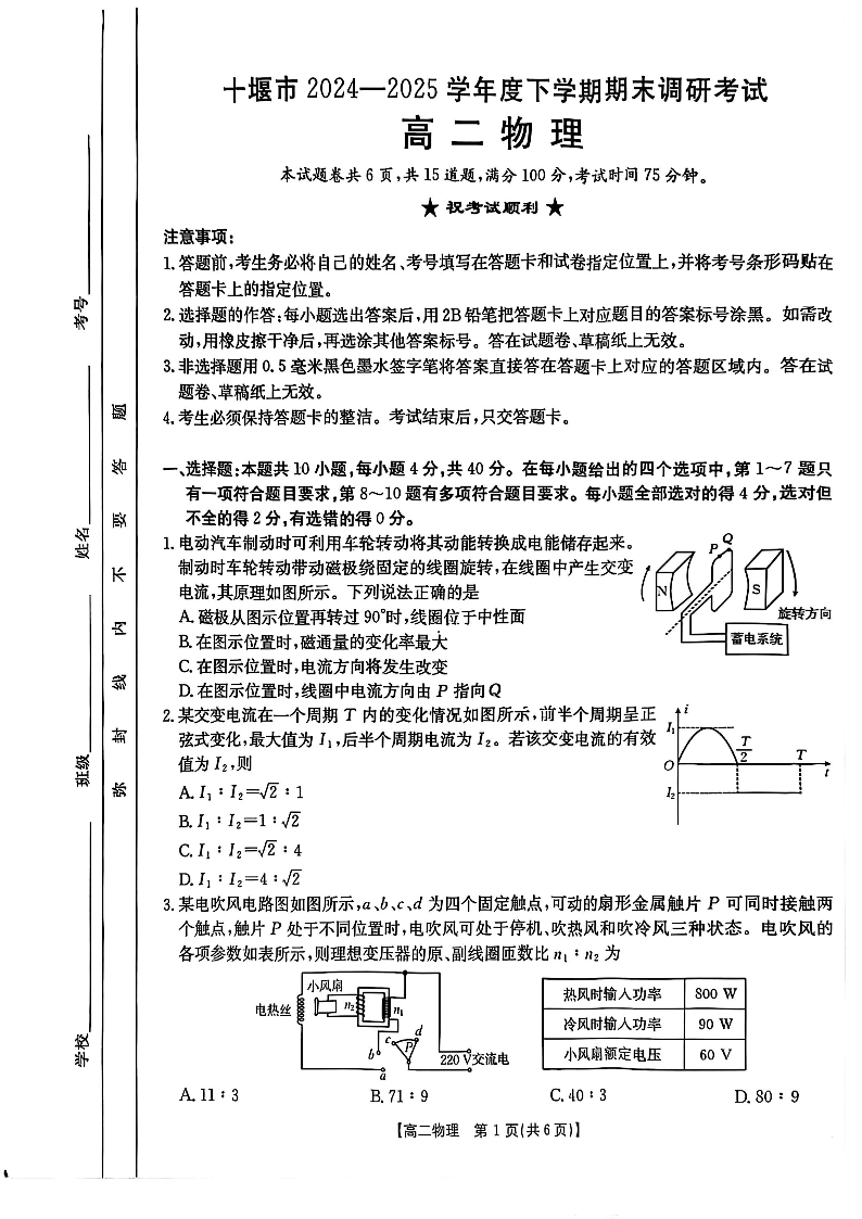 湖北省十堰市 2024-2025学年度下学期高二期末调研物理