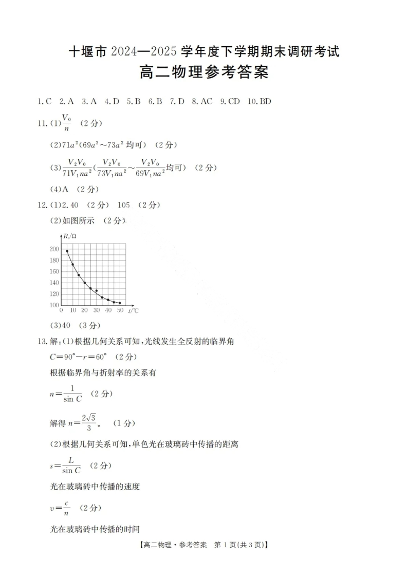 湖北省十堰市 2024-2025学年度下学期高二期末调研物理答案