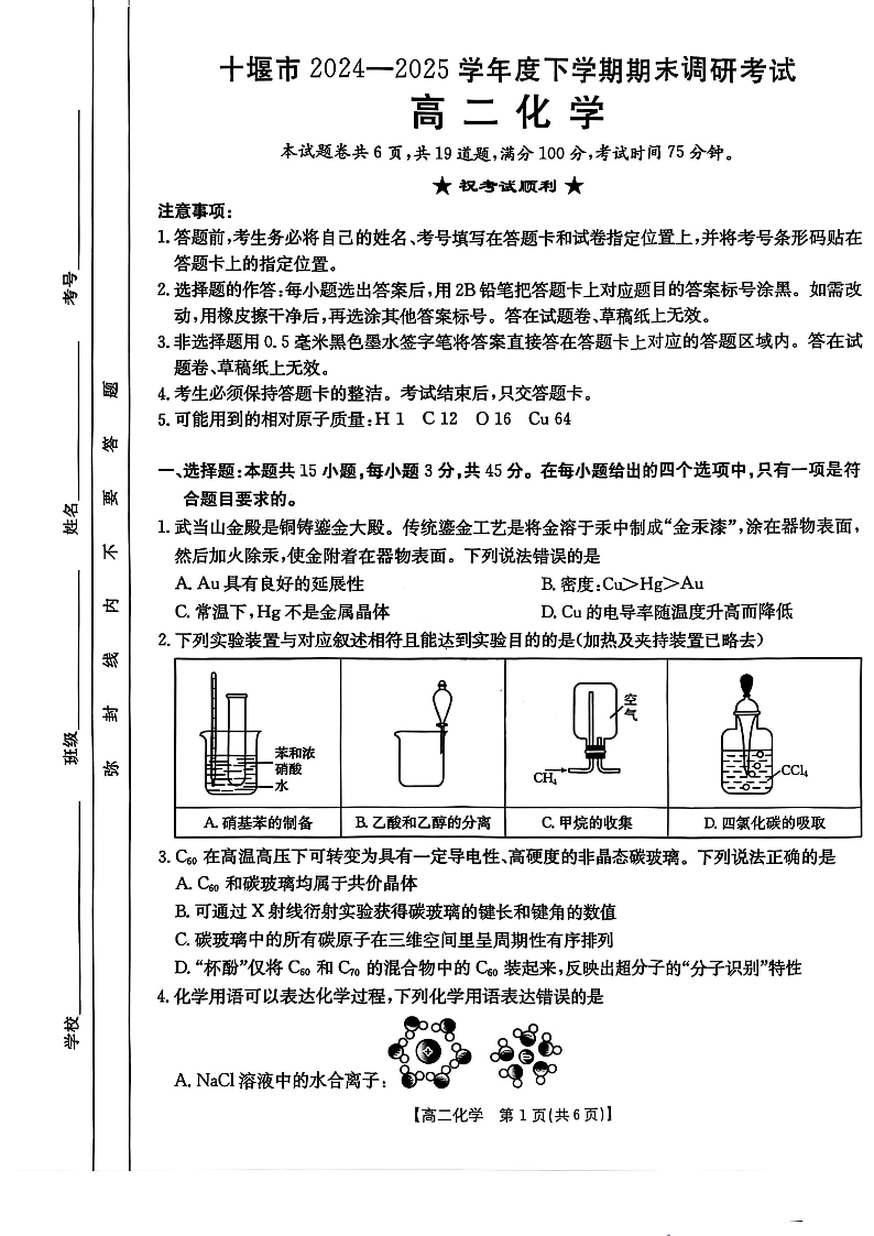 湖北省十堰市 2024-2025学年度下学期高二期末调研化学